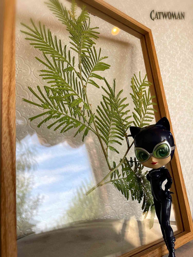 ホワイトオーク材のウッドのフレームにアカシアデアネイさんを2枚のガラスで挟んでフレームINしてみました𓂃🌿𓈒𓏸