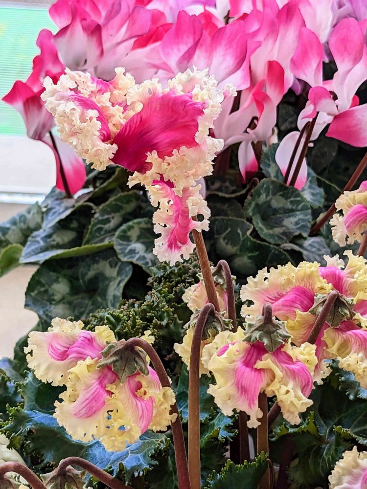 シクラメン💛🩷天使のベル🔔 花も名前も可愛いくて💐花屋さんではあまり見掛けないフリルの花びらをした珍しいシクラメンです🥰 (2月植物公園⛲大温室で📱)