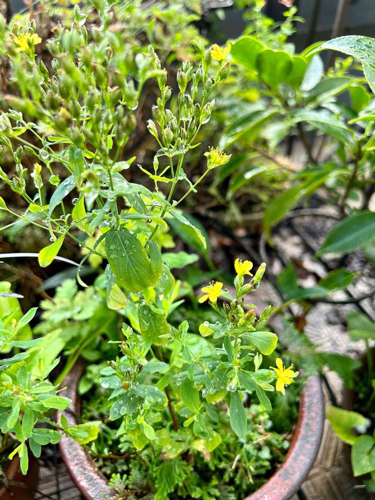 嵐の夜明け、バルコニー小庭の植物たちは上機嫌☘️です。ホトトギスの鉢の真ん中に生えた弟切草は開花🌼ラストスパート❣️