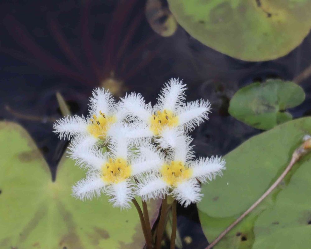 外池一面にハート型をした葉を水面に浮かせ、花弁は白く中心が黄色い花を咲かせます。