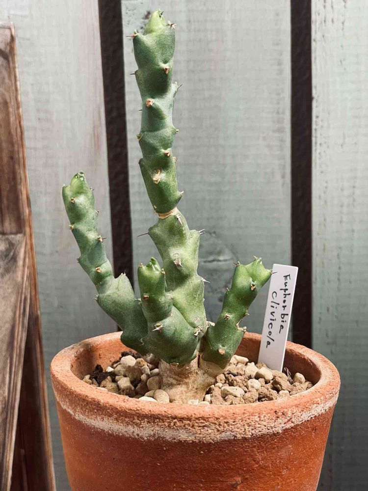 塊根から伸びるモスグリーンの太い枝が魅力的なクラビコラさんです。お店で見た時はピンときませんでしたが、植え替えてシゲシゲ眺めてみると、その素敵さが分かってくるタイプの子です。
