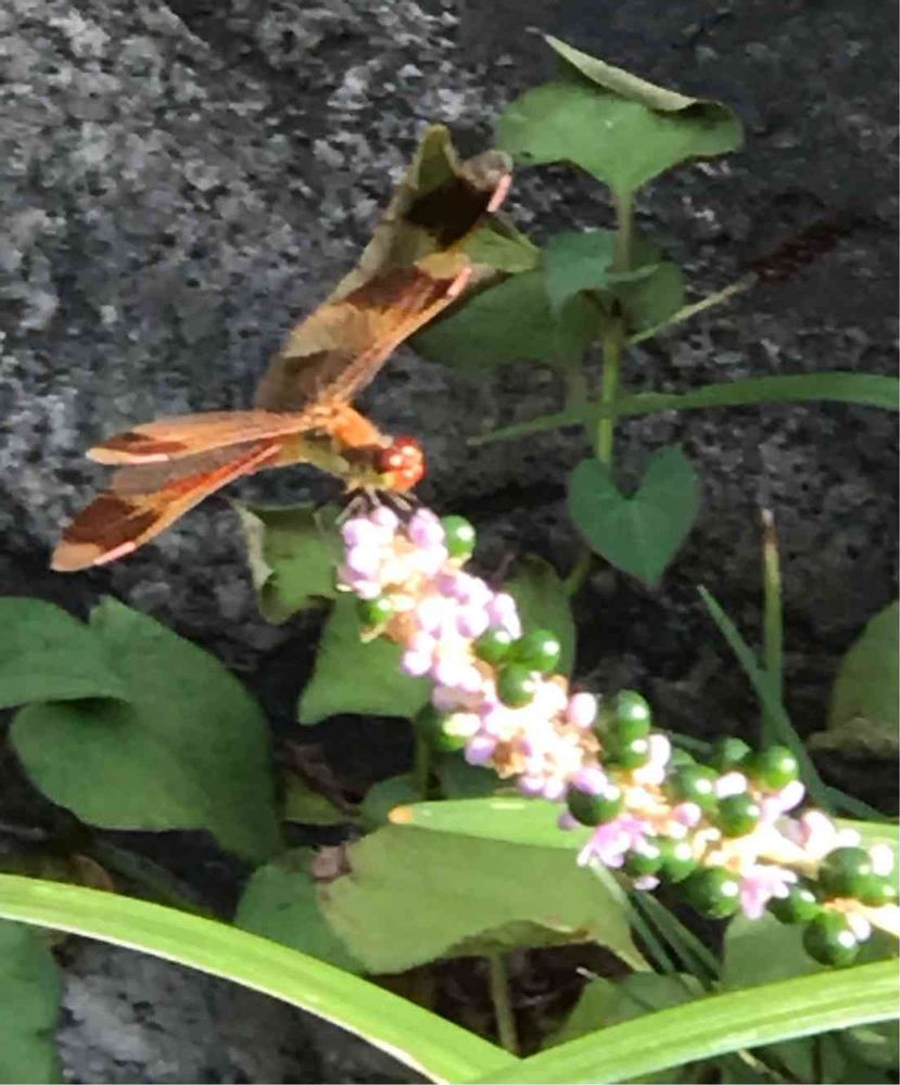 庭の花を見ていたら、たまたま赤とんぼが、ヤブランに止まっていたので、急いでスマホで……暫く止まったままだったので、撮れました。