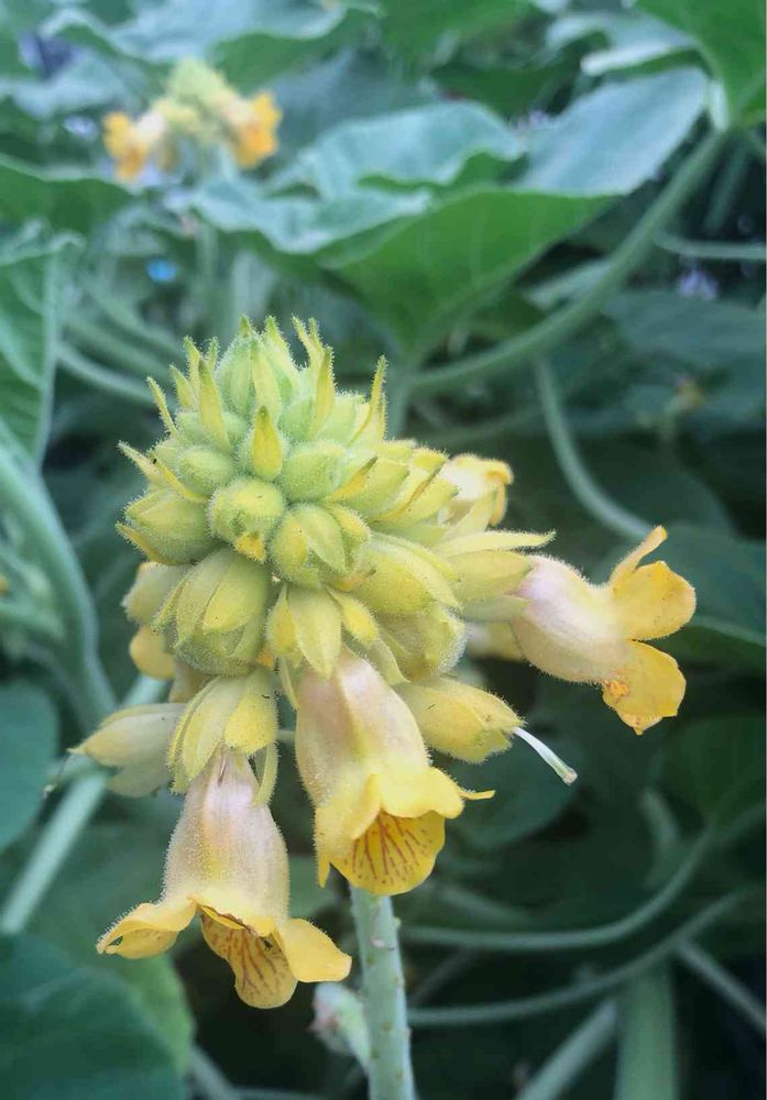 おはようございます。散歩道の歩道花壇にツノゴマがたくさん花をつけています。触るとベトベトします。