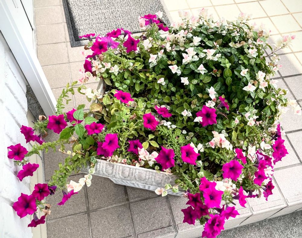 ハツユキカズラとサフィニアかクリーピア、それとも他の似た品種か不明の匍匐性の元気なペチュニアの組み合わせが涼しさを演出してくれていました💙😍💜😍🤍😍