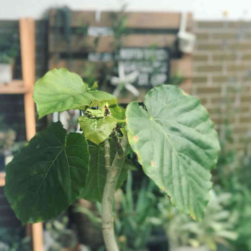 ウンベラータの新葉の上に2匹のアマガエルが♡