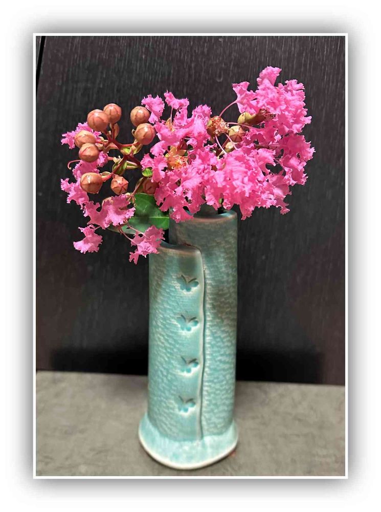 📝この写真画像は、我が万葉の中庭で満開に咲いている「百日紅」の紅色の花を、三股焼きの匠師作品の、高さh=12cm直径φ=3cmで上部の挿し口が5mm幅の螺旋状になっている珍しい構造の小さな花瓶に生花としてみたものデス🐶