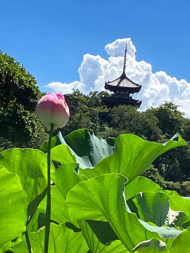 “真っ青な空と五重塔、手前には大きな蓮の葉っぱたちとスッと伸びた