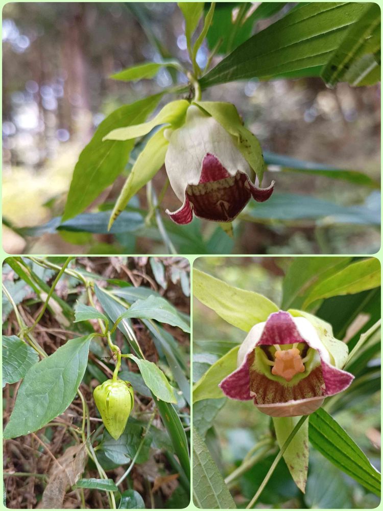 花冠は幅の広い鐘形で下向きに咲き、先は5つに浅く裂けて反り返る。 花の色は白緑色で、内側に紫褐色をした筋や斑がある。 花冠の長さは3センチくらいである。 萼片は5枚である。 雄しべは5本で、花粉を出した後に先が3つに裂ける。葉の特徴葉は細長い楕円形で互い違いに生える(互生)が、側枝の先には3、4枚が集まってつく。 葉の裏面は粉白色となる。 蔓や葉を傷つけると白い乳液が出る。 また、触れると青臭い臭いがする。