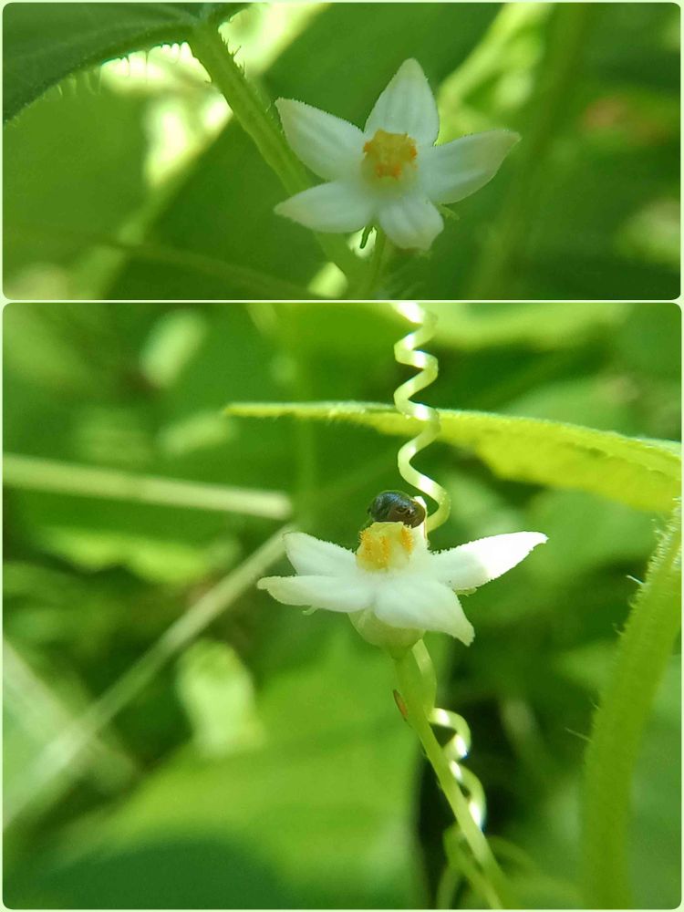 スズメウリ、昨年は浮き島沼の桜の木に絡んでるから、雄花雌花両方見れたし、つる下がってるからわかりやすかったの。⚪🌿