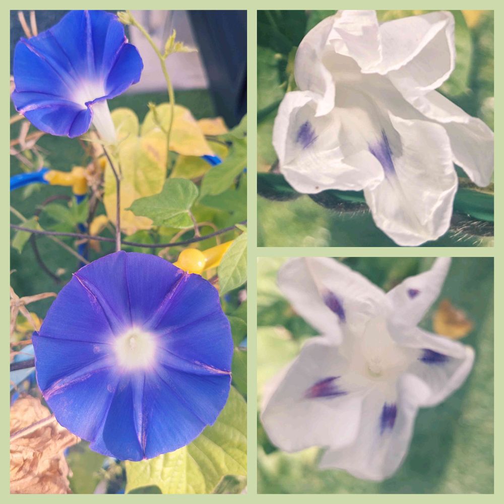 小学校から持ち帰ったアサガオ(左の青い方)は家を出発する時に全開で咲いてるけど、私が育ててるアサガオ(右の白い方)は半開きで未だに全開になった姿を見れてない💦