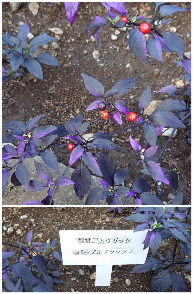 この観賞用の唐辛子は「パープルフラッシュ」というかっこいい名札がついていました。葉っぱはみごとなバープルでした😀(農業試験場内にて)