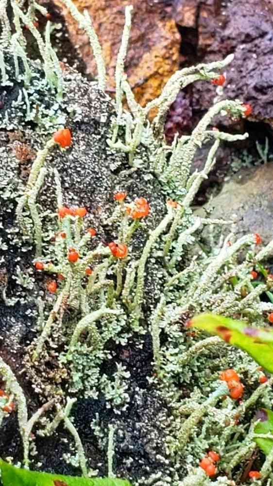 チャツボミゴケ公園の岩肌に赤い花?をつけた植物がありました