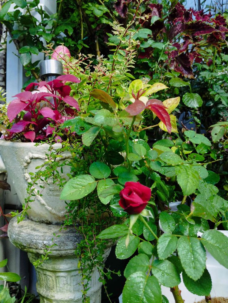 ↖️赤い葉っぱ🍂は挿し穂のコリウスです。庭中この増やしたコリウスがあちこちに植えてあります😊