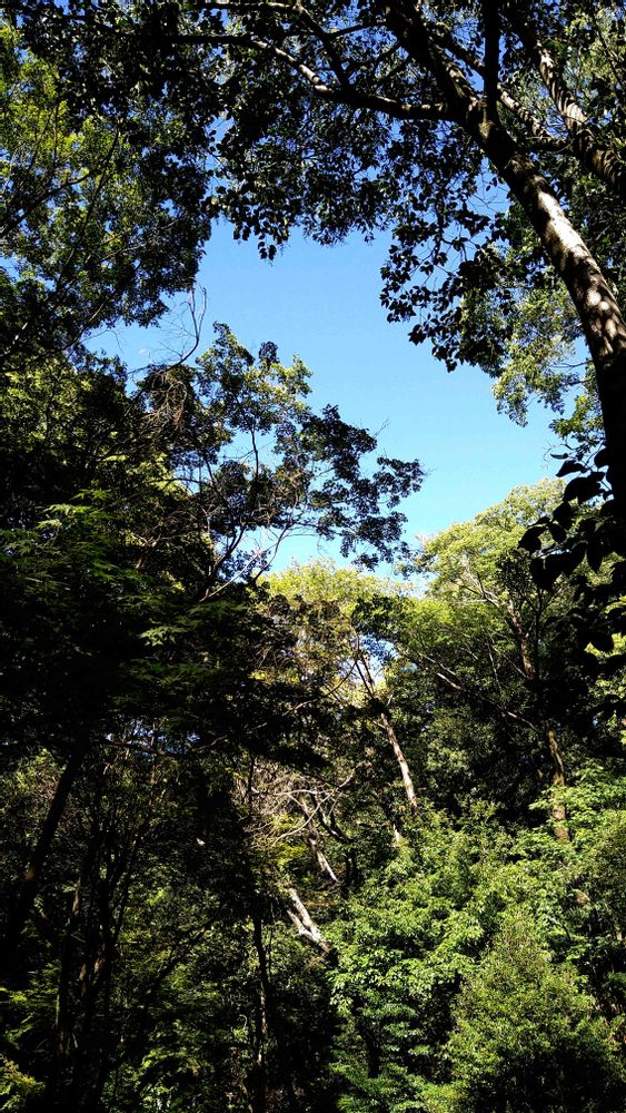 木が高いなぁーと思って見上げてみると、青空を囲むように木が生い茂り、美しい光景が広がっていました。