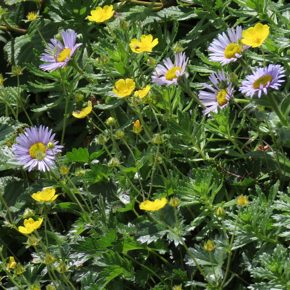 薄紫のミヤマアズマギクと咲き競っているせいか、岩場の花のより背伸びした花茎には小さな葉が見られます。
