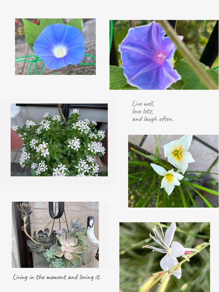 朝顔2種、タマスダレ、ガウラ、マローム、サントリー フェアリースターです。