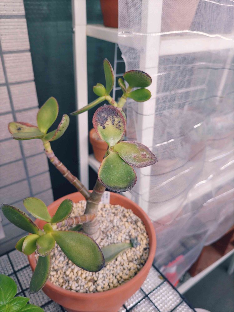 あまりにも日差しが強いからシェードみたいなのを被せて多肉棚に移動しておいたら、黒くなってポロポロと。。。