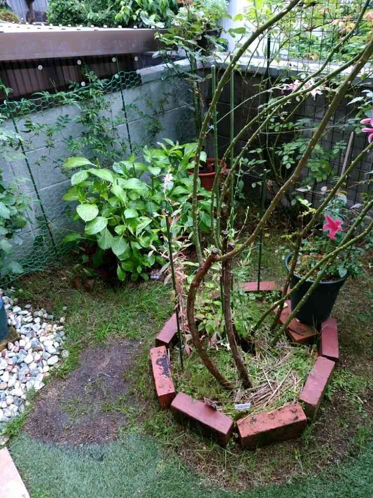 手前のレンガで囲んだバラが、「天空のバラの五線譜」のニュー・ドーンです。ガウラやクレマチス/プリンセス・ダイアナを絡ませています