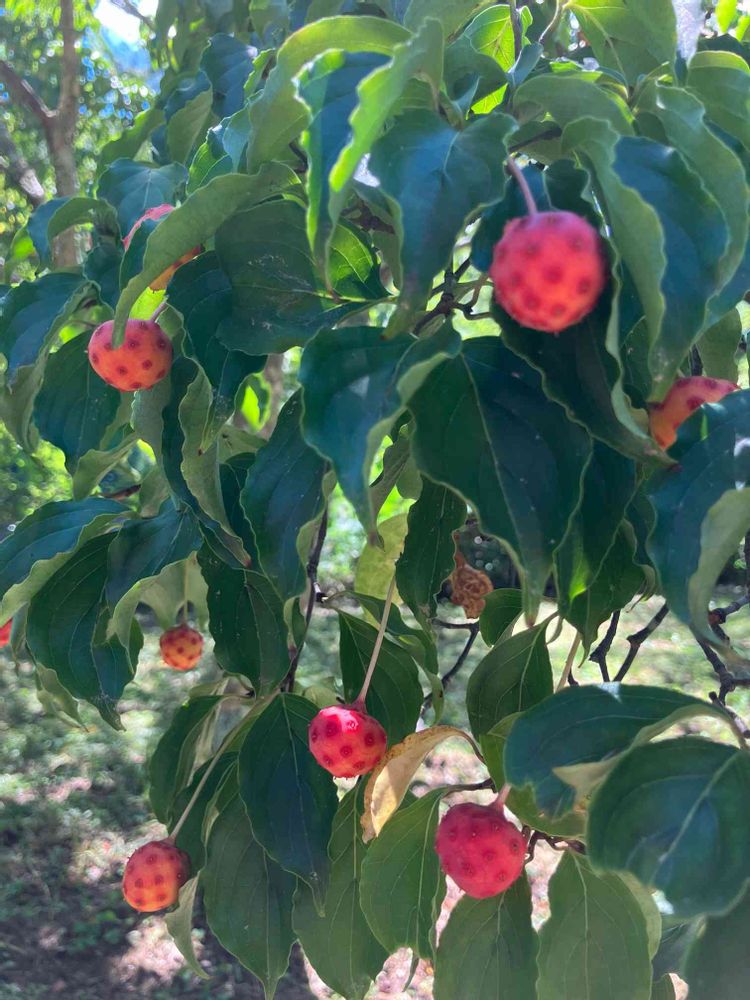 真っ赤に熟したヤマボウシ、見つかるかな🤭