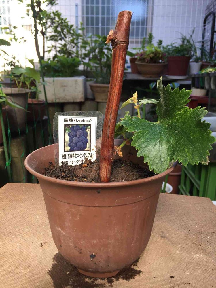 昨日山梨へ桃狩りへ行き、売店で巨峰の苗買ってきました。バスに揺られついていた芽が取れた!鑑賞用として育てます。