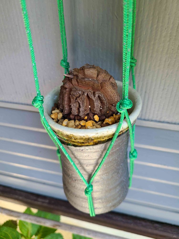 亀甲竜です。冬型の塊根植物でこれから葉が出てくる予定です。陶器タンブラーに穴を開けて植木鉢にしました👍