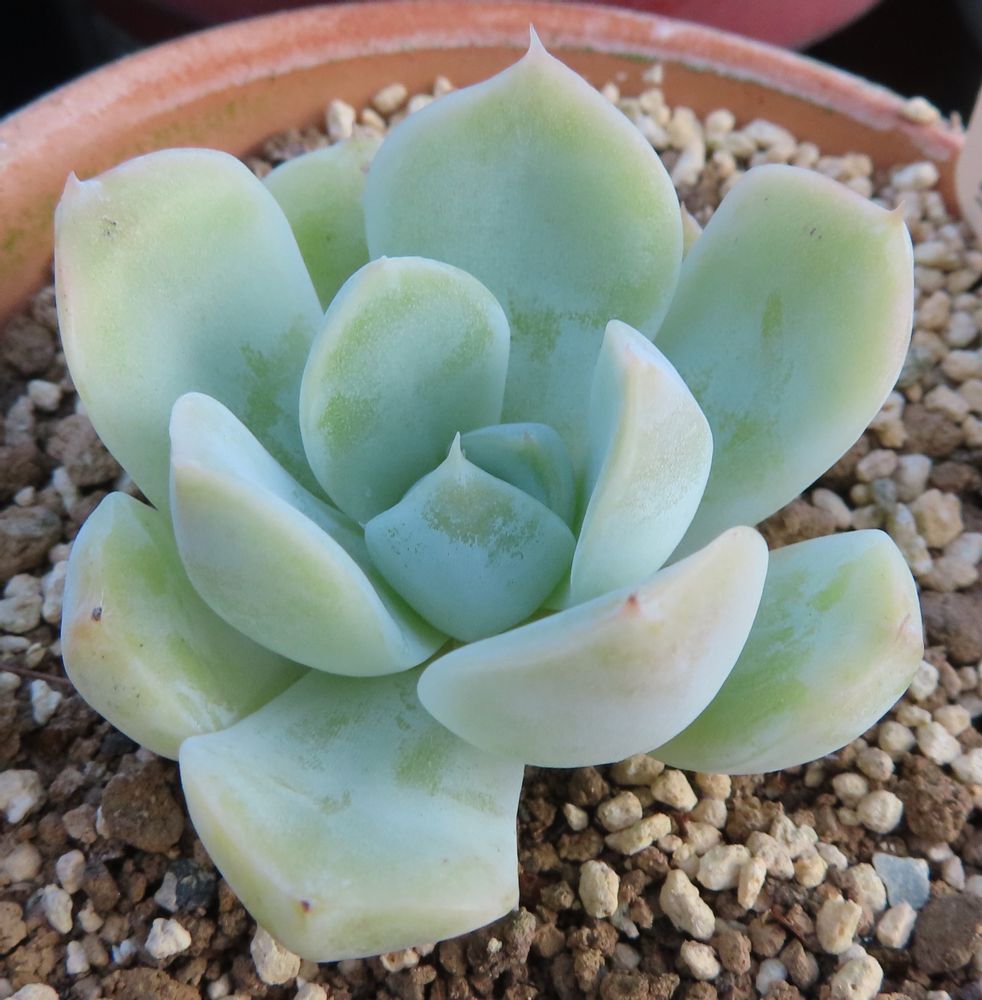 4日程前に少し涼しい日があったので,ちょっとだけ多肉たちに水をやった。このエケベリアのイザベルは,それまで全体に白っぽかったけど急に緑が戻ってきた。水やりが色にも関係しているということ?
