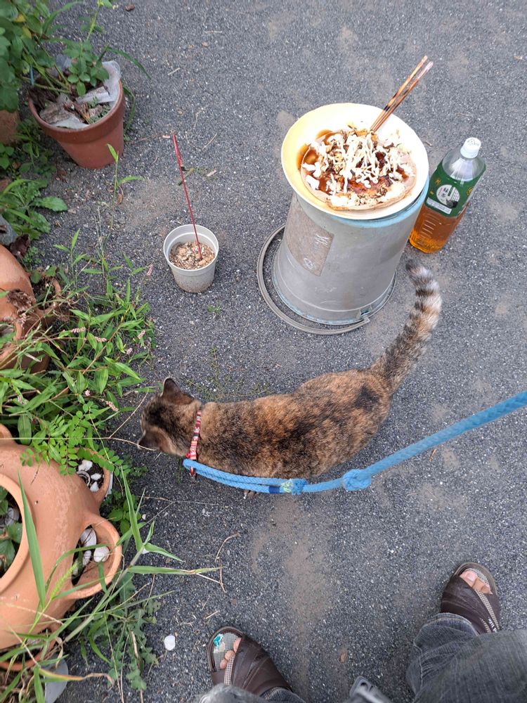 部屋のなかより外で風にあたったほうが涼しくてよいや 庭にて夕飯をキャンプ風お好み焼きで愛猫とともに 蚊取り線香が赴きを増しますな✨