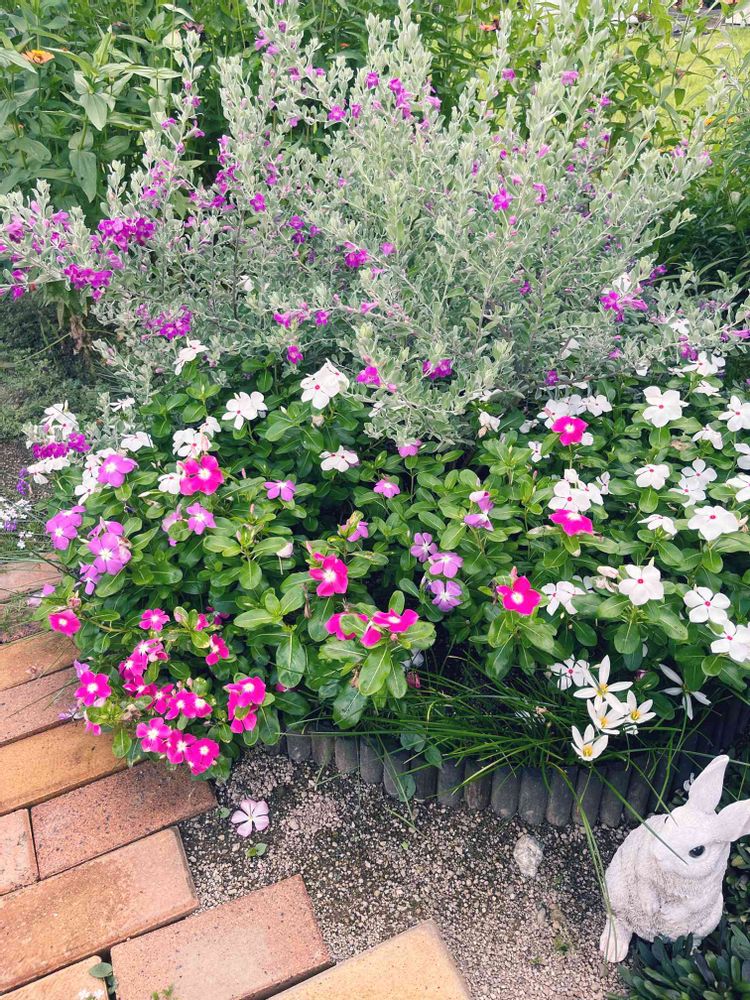丸い花壇に、外側からタマスダレ、日々草、中心にレウコフィルムを植えてます。