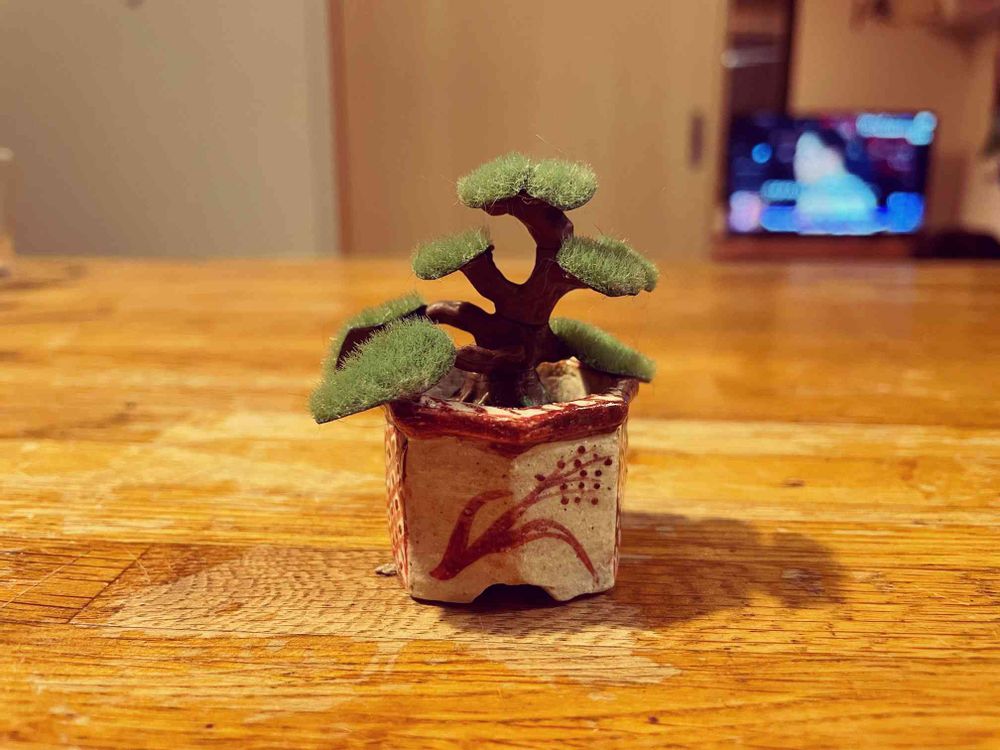 赤絵風の豆鉢にホビーショーでもらった盆栽の模型を入れてみた🌲