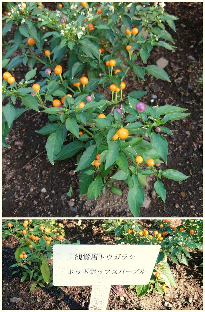 この観賞用の唐辛子は「ホットポップスバープル」という名札がついていました。オレンジじゃ?と思いつつ、よく見たら、きれいなパープルの玉🟣が見えました🧐😀(農業試験場内にて)