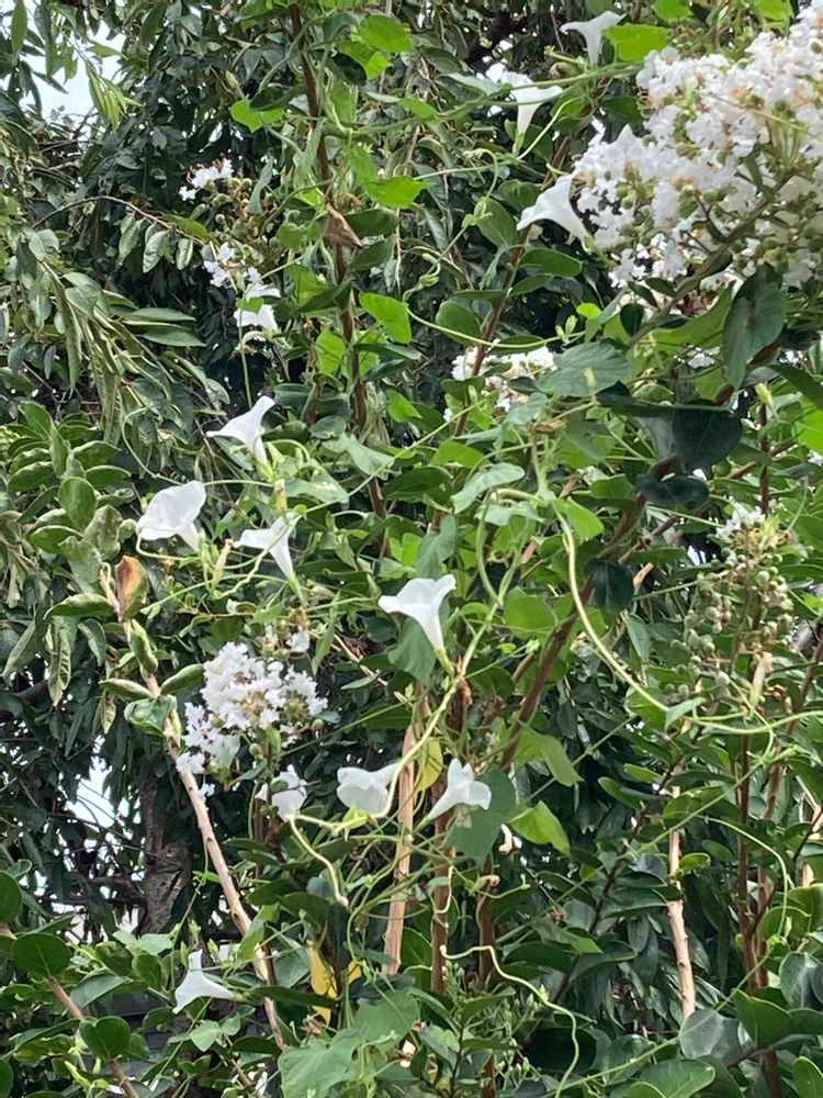 白い百日紅に白い朝顔が這い上って来てくれて… 素敵なコラボになりましたね〜!