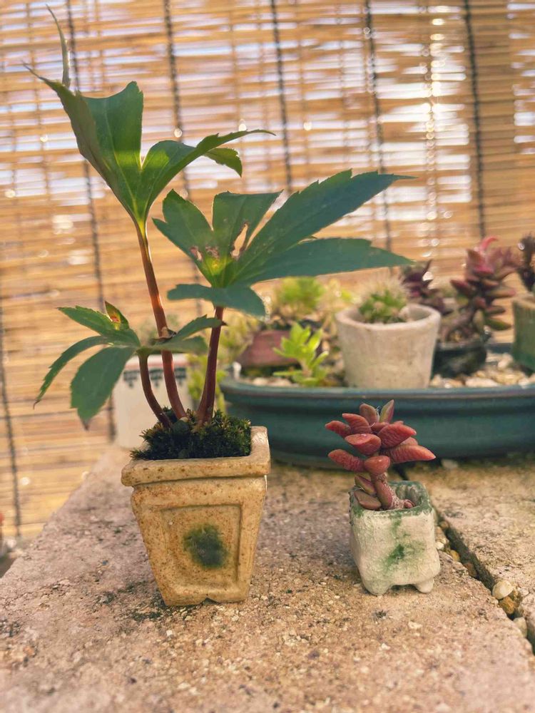 最近、山野草を始めました。旦那は盆栽、私は下草を学び始めました。 自宅で陶芸しています、豆鉢など作っています。の