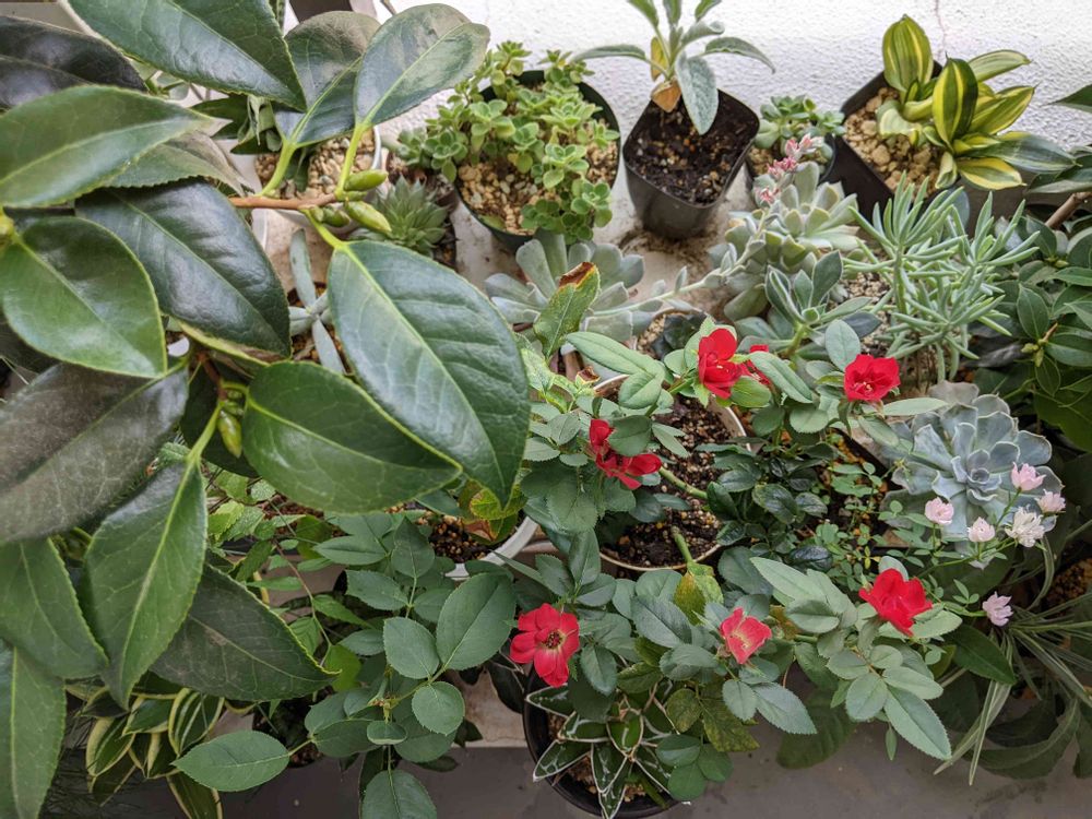 今日は何をアップしようかとベランダを眺めましたが決めきれず、棚の1角を撮りました。育てている植物の4分の1くらいです。