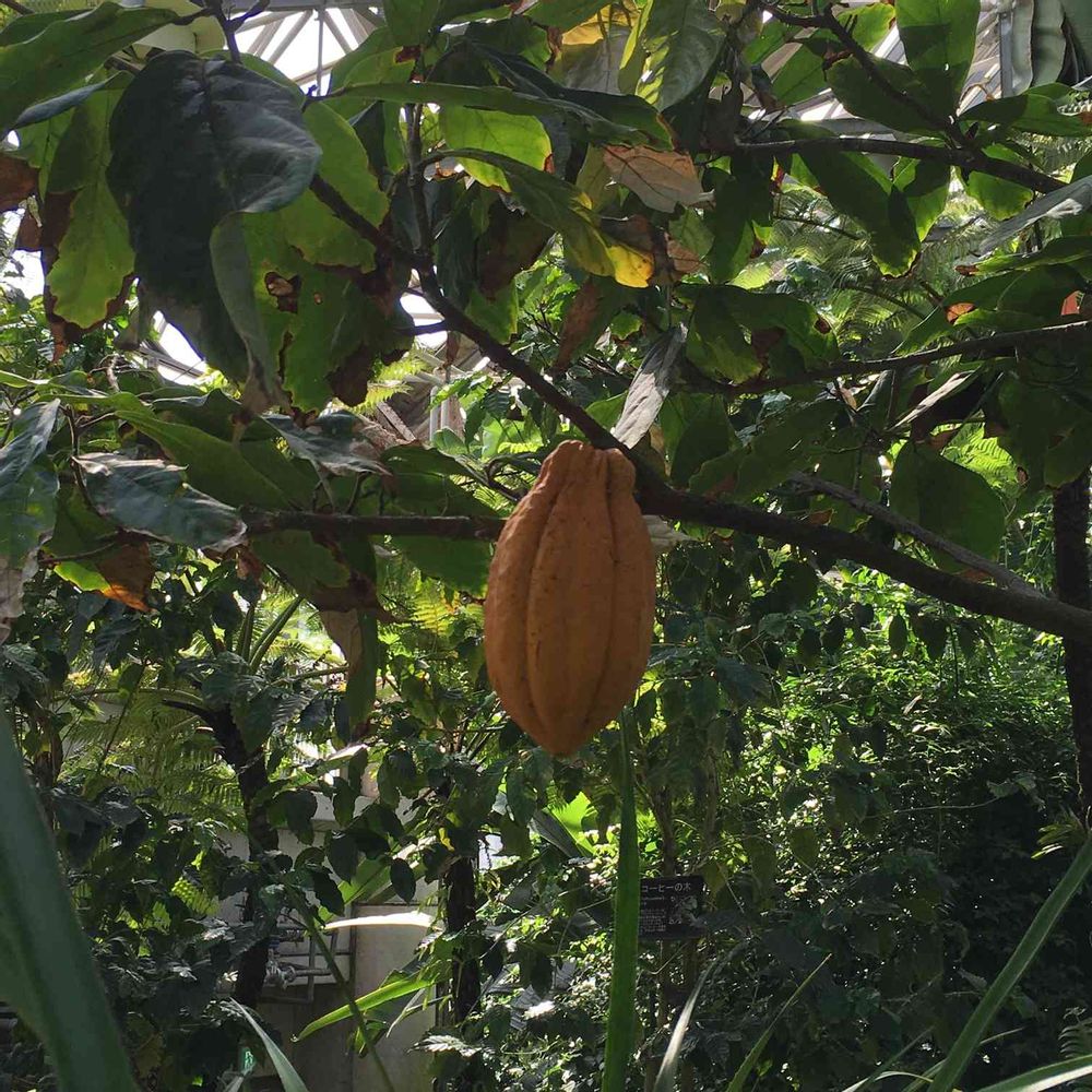 熱帯植物の温室のカカオ。他にもグアバ、バナナ、ドリアンなどが揃い踏みです。
