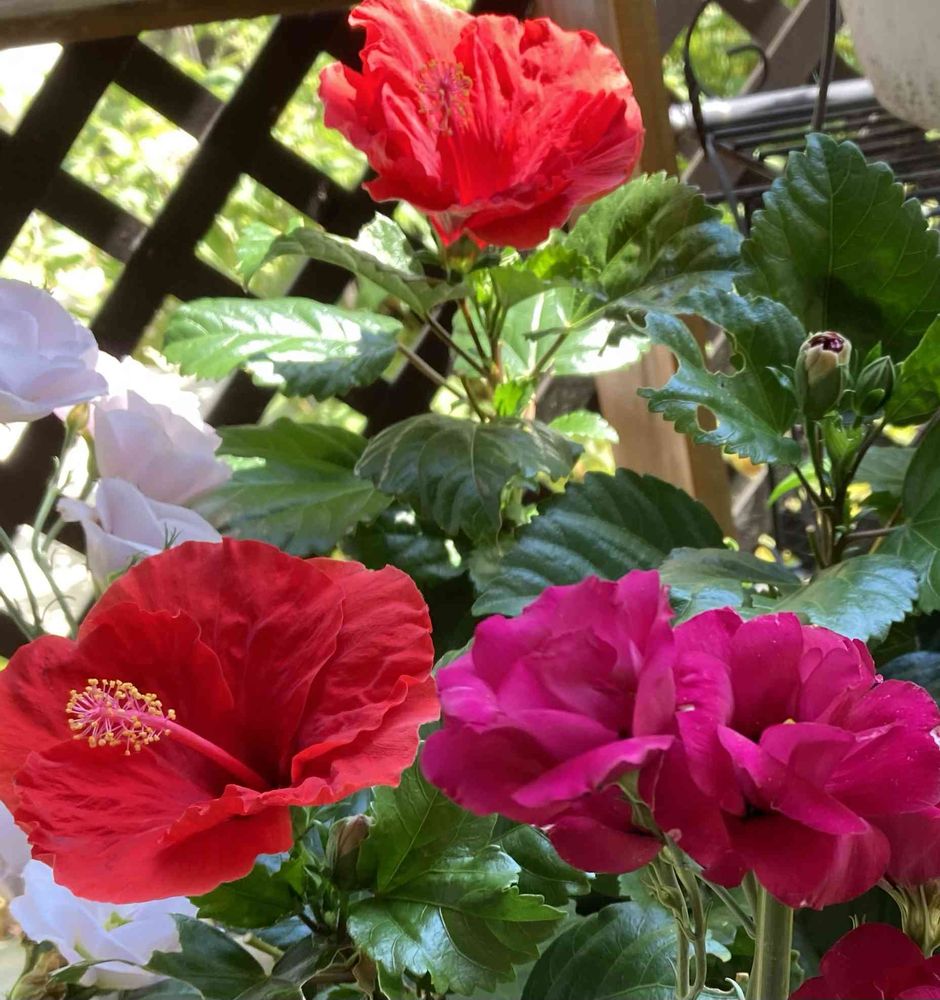 赤いハイビスカス🌺にローズピンクのトルコききょう🩷