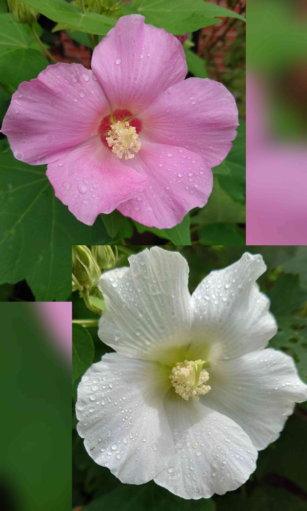 ピンクと白いフヨウの花、雨の雫💧が光って綺麗です🤍💗🌿