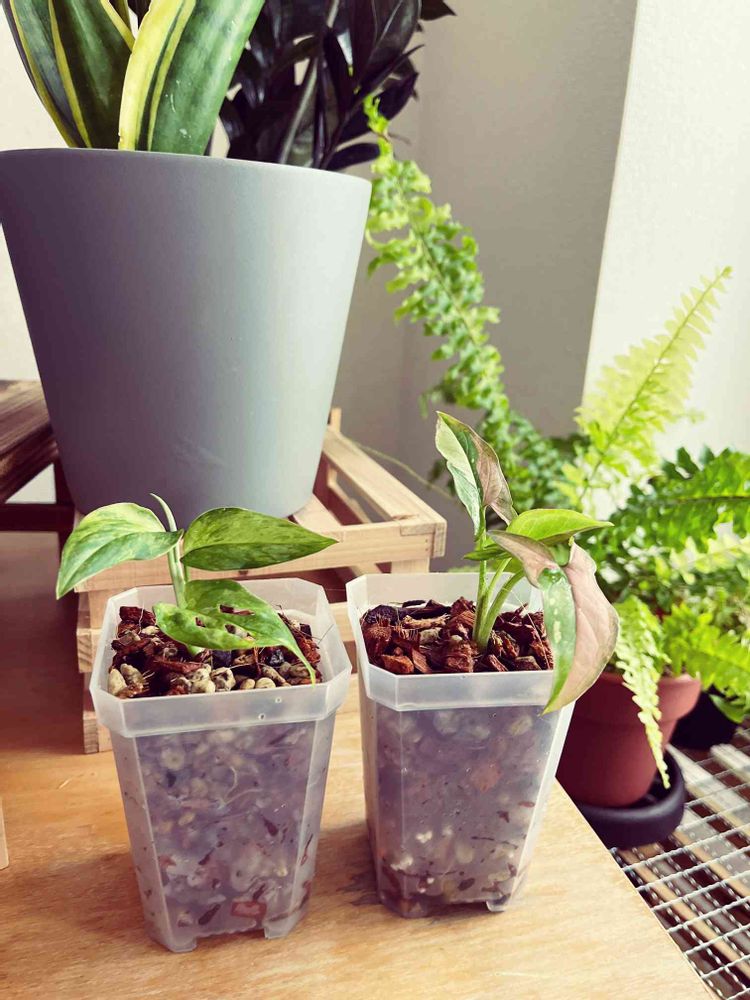 シンゴニウムのトリカラーとマドカズラミントがなかなか大きくならないので、根っこチェックを兼ねて鉢を透明なプラ鉢に変えました🙌🏼