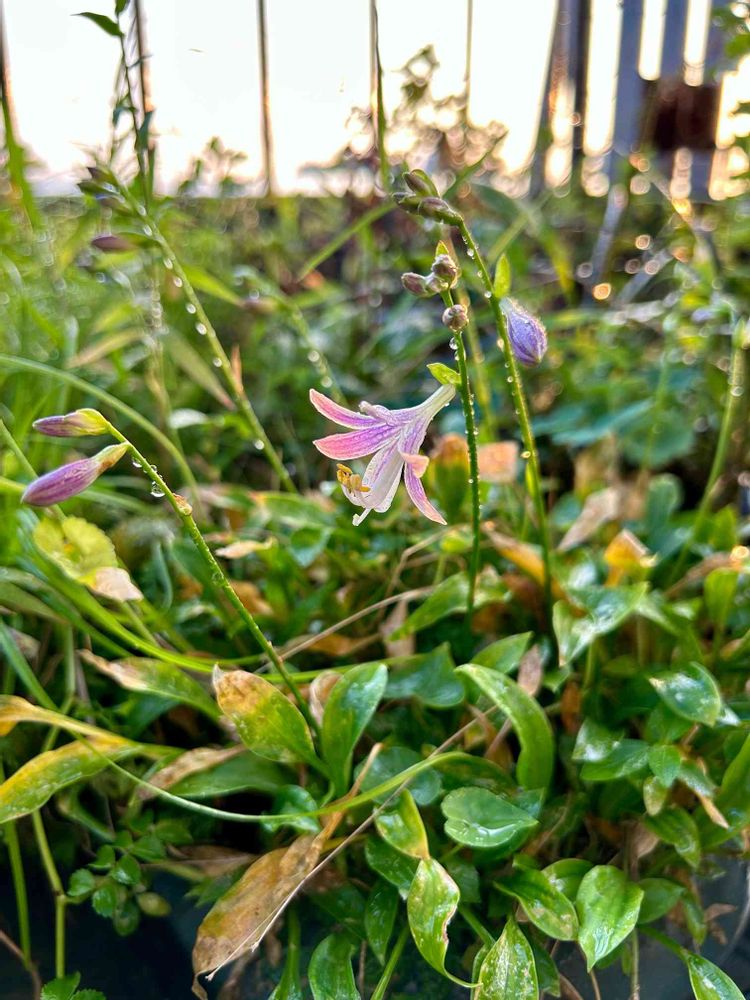 植え替えをサボっているうちにギッシリ芽が詰まってしまい、花茎が上がって来なかった姫ギボウシ。猛暑に葉が焼かれる中ようやく開花👸👑*゚です