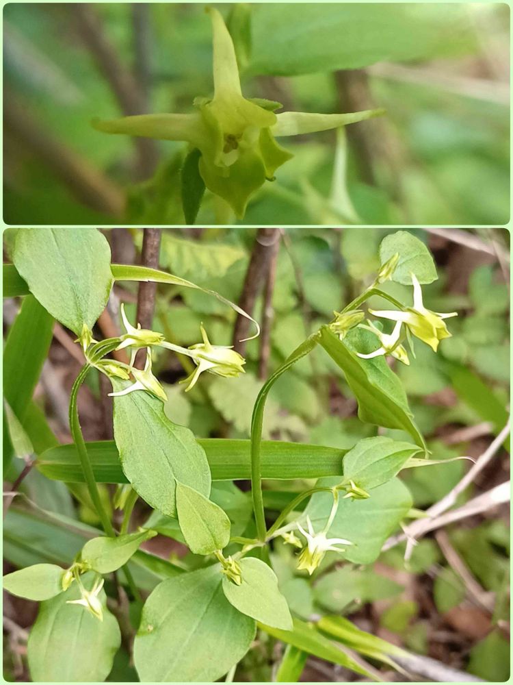 船の錨(碇)の形をし、イカリソウの5~6cmと比べ、1~2cmと小さな花。色も薄黄緑と遠目には目立たないが、群生した花に目を近づけると、イカリというより星をちりばめたように見えます。