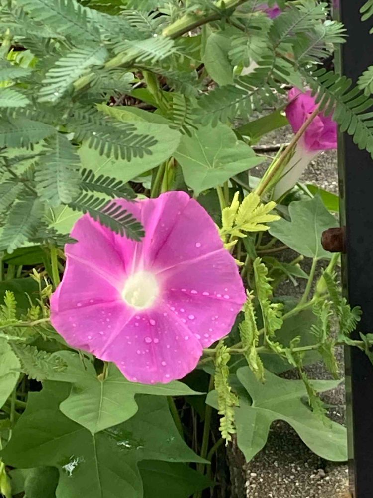 子どもが小学校🏫の時に持ち帰った朝顔が地生えで毎年咲きます。今朝、夕立の後のピンク🩷の朝顔がきれいだったので。