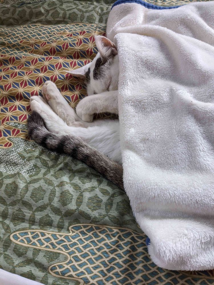 おはようございます。うちの猫🐱足ぴーんと伸ばして🐱寝てますね〜オジイ猫様なのでたまに足たたむの忘れちゃうのかも😸😸