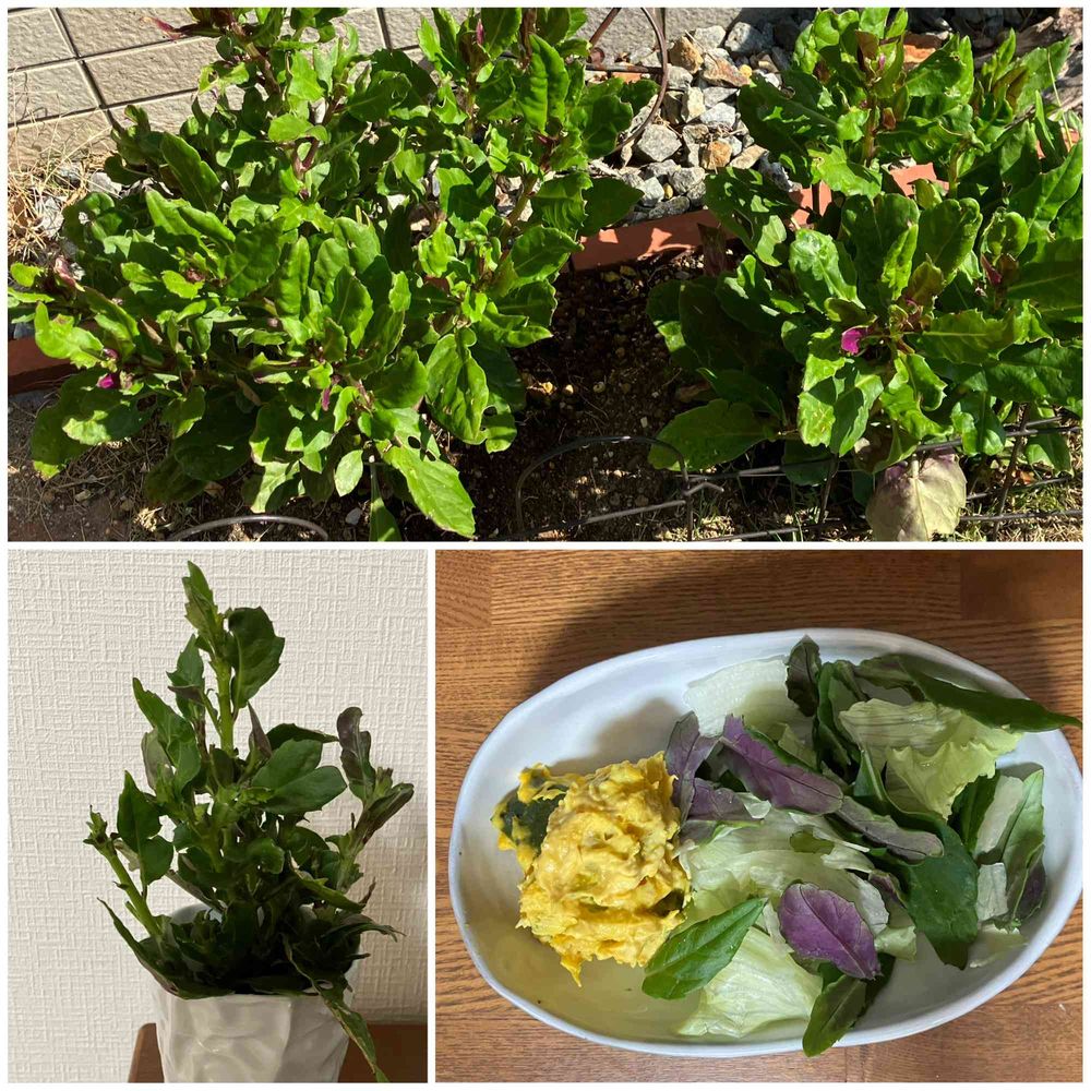 マンションの金時草を収穫🌱して南瓜🎃のお月様サラダ??にしました。