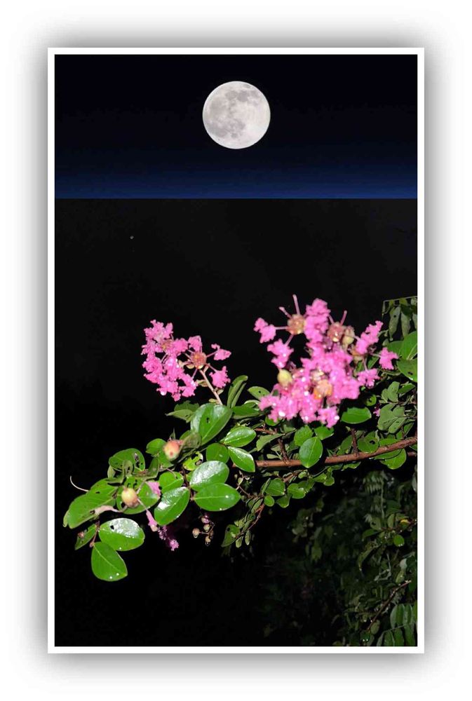 📝この写真画像は、万葉の中庭で満開に咲いて散り始めている「サルスベリ:百日紅;Crape myrtle」の枝花越しの遥か上空に輝いている満月🌕スーパーブルームーンをあたかも撮影したかのように写真画像を合成加工したものデス🐶