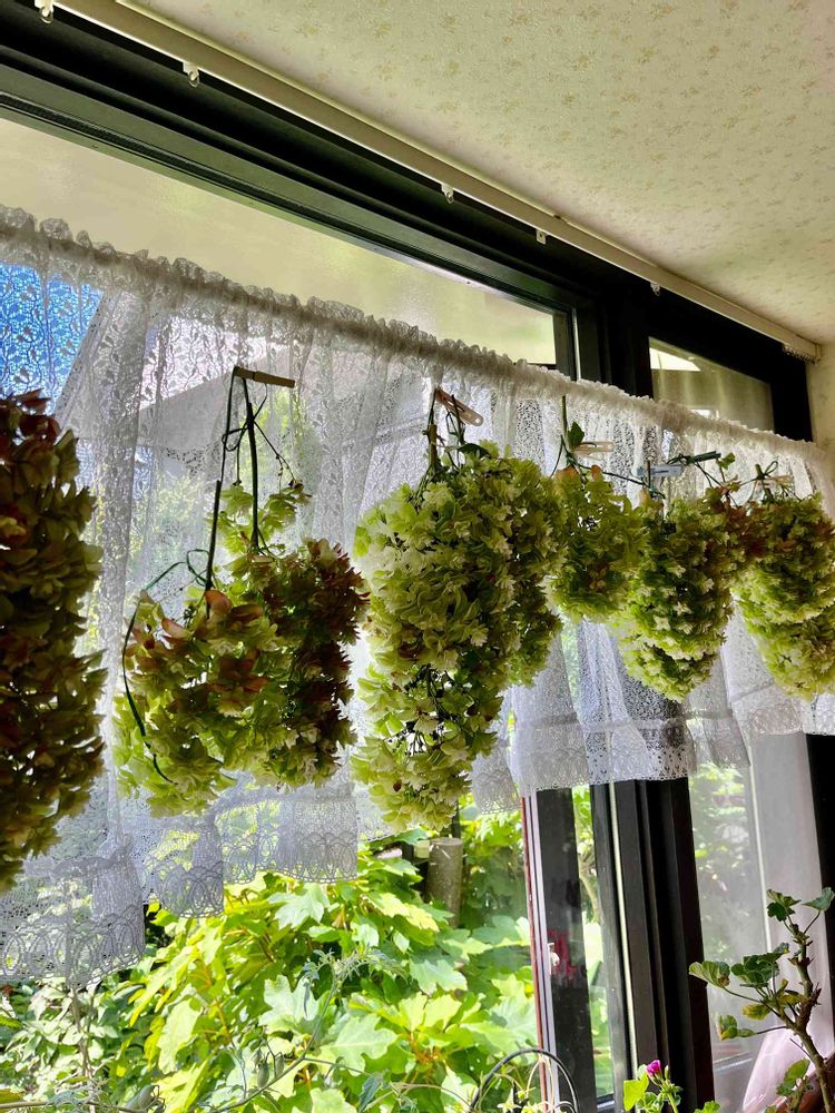 カシワバアジサイをカットして吊るしました 窓の外に見えるのはカシワバアジサイの木です