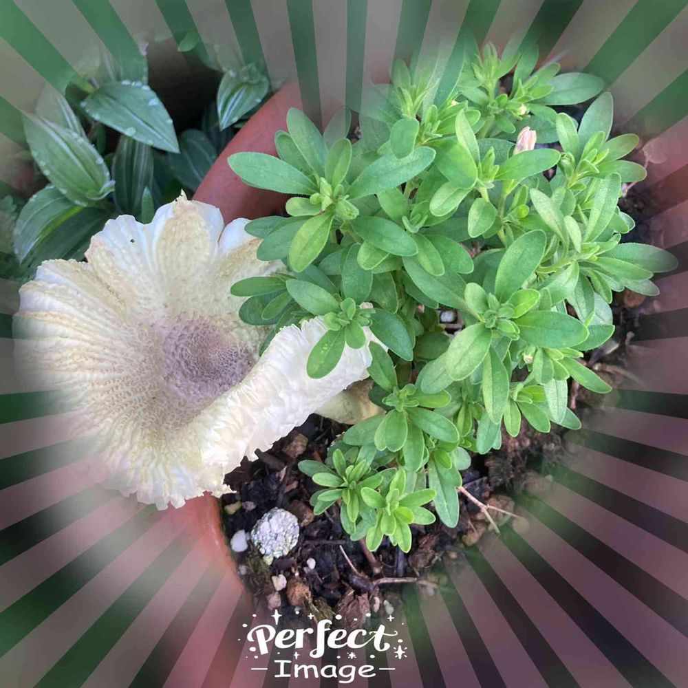 切り戻した、カリブラコアの隣に白いペチュニアが咲いた?!と思ったらキノコでした(≧з≦)