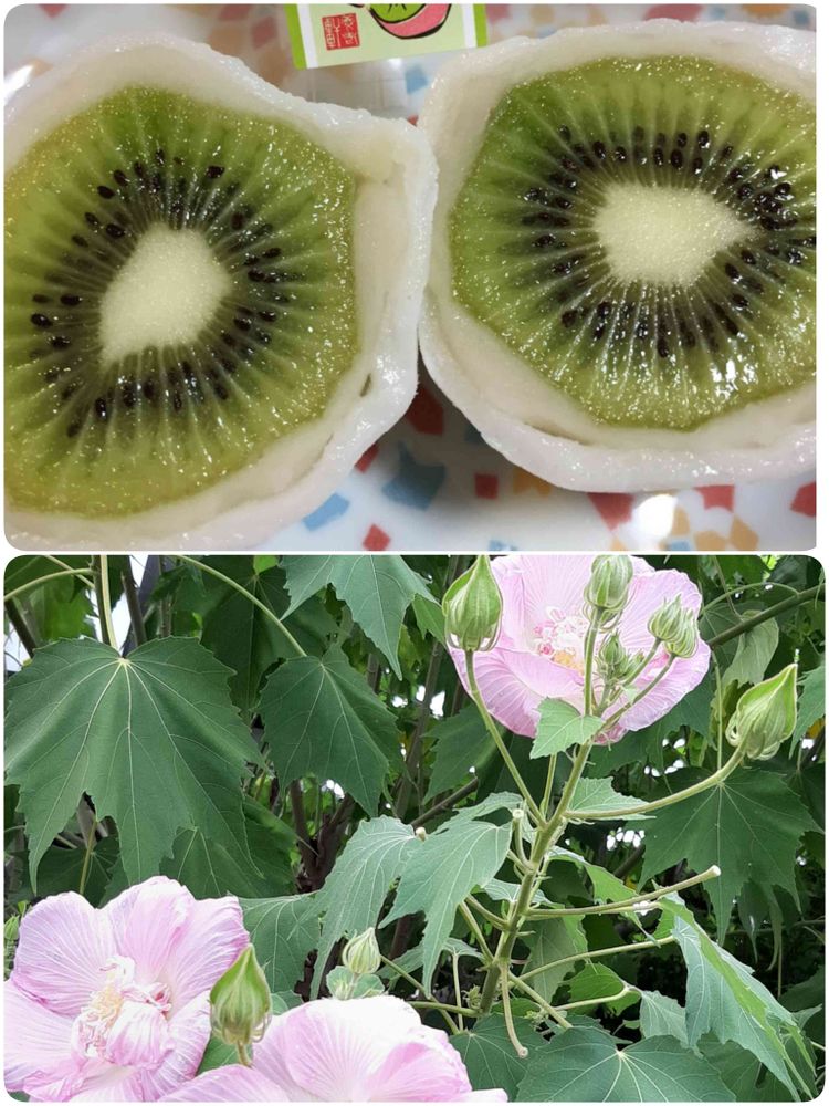お店の人もお勧めキウイ大福💕まだまだ咲いてるピンクのふよう。関西は夏日。頑張りましょう‼️
