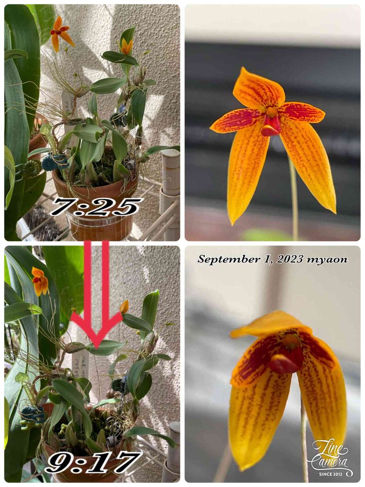 つぼみが咲きそうな状態だったから家の中に入れて鑑賞しましょと思ったら今にも咲きそうなつぼみなのに花が咲いてくれない…。なので昨夜ベランダに出しておいたら咲いていましたよ〜ビタミンカラー&パッションカラーのコラボっぽいお花。バルボ特有の香りはなし❣️で、9時すぎる頃お花は閉じ始めた。お花の大きさに比べて花茎が超細いの…しっかりとしたしなやかな茎なので心配ご無用って感じ。