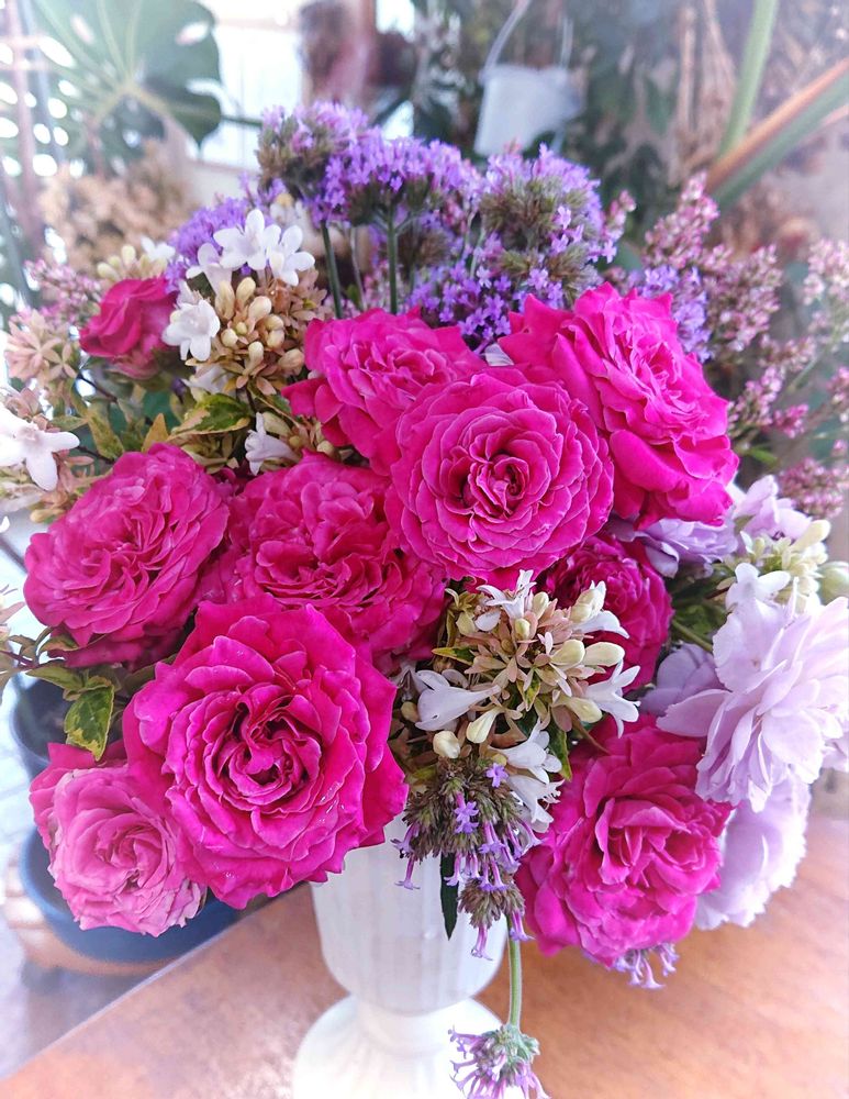 小さめだけれど、たくさん咲いてたオール4ラブ🌹切って他の花色々足して飾ってます🎵 ちょっとゴチャゴチャだけど、まぁ~いいかぁ😅