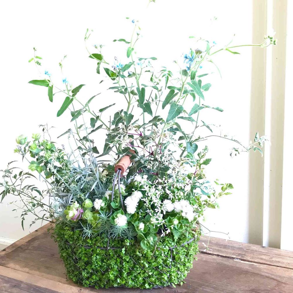 小さな葉が愛らしいベビーティアーズのバスケットに、ふわふわの寄せ植えを☺️