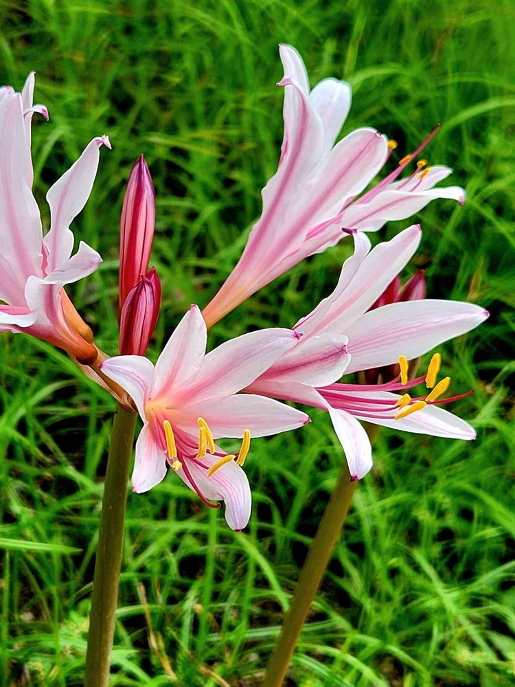 中国原産で、ナツズイセンにもよく似ていますが花は白色で中央に赤紫色の筋が入ります。こちらでは珍しい花です